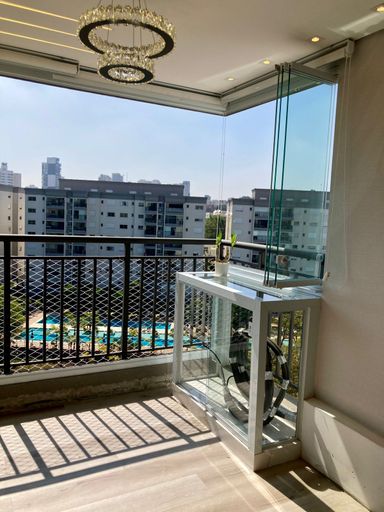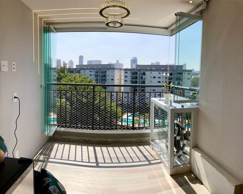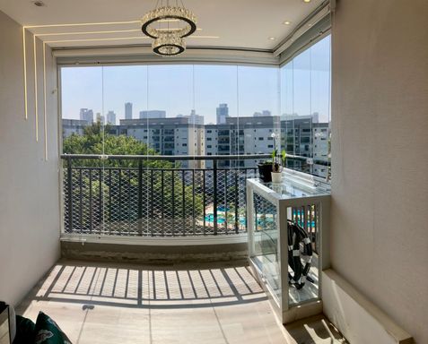• Varanda gourmet fechada com vidro e persiana, vista parque