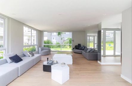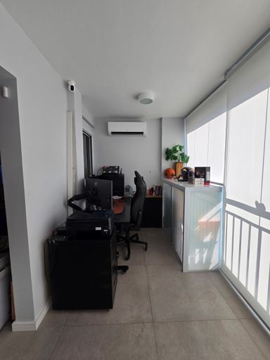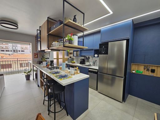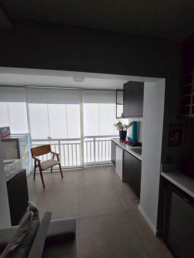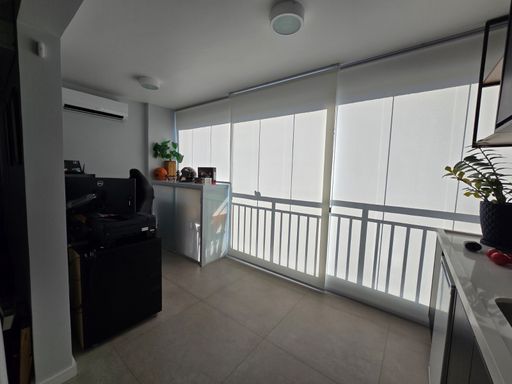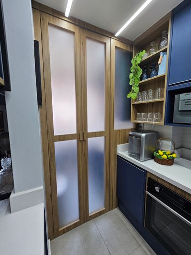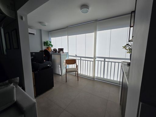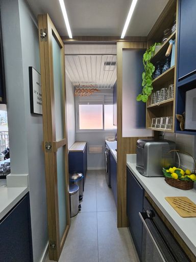 🌇 Varanda gourmet fechada e nivelada com a sala, com vidro e reforçada com película anti calor, equipada com armários, freezer e espaço para armazenar um robô aspirador.