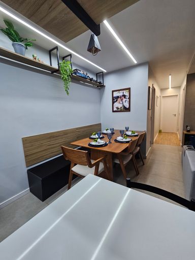🍽️ Sala de jantar com mesa para 6 lugares, incluindo 2 bancos-baú.