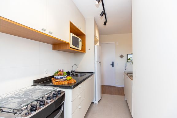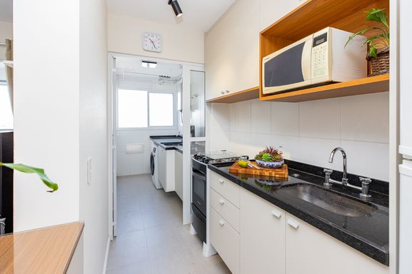 A cozinha americana, moderna e funcional, se conecta à área de lavanderia de forma prática, otimizando o espaço e facilitando o dia a dia. Na área íntima, você encontra dois dormitórios aconchegantes, sendo uma suíte planejada para oferecer ainda mais privacidade e bem-estar ao casal, além de um banheiro social completo que atende com conforto aos visitantes e moradores.