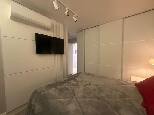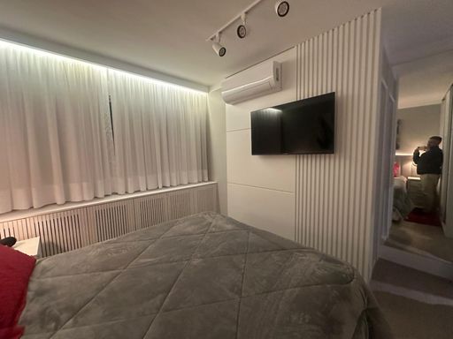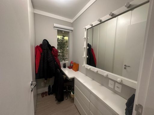 O terceiro dormitório foi mantido e transformado em um funcional closet e escritório, oferecendo versatilidade, organização e a possibilidade de reversão conforme a necessidade do futuro morador.
