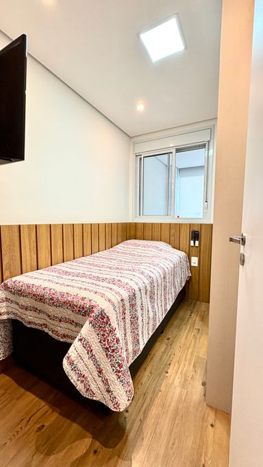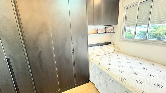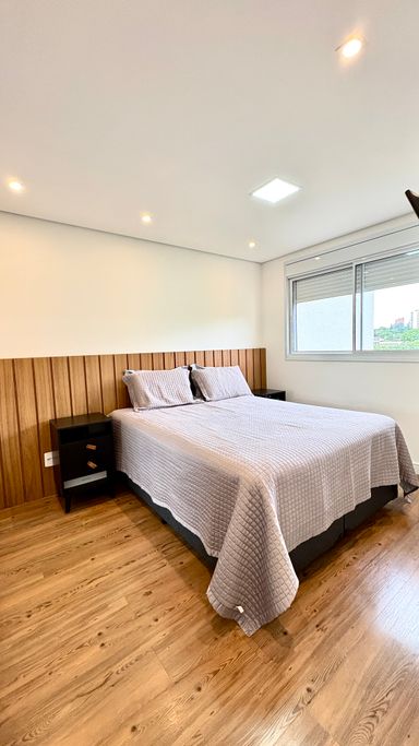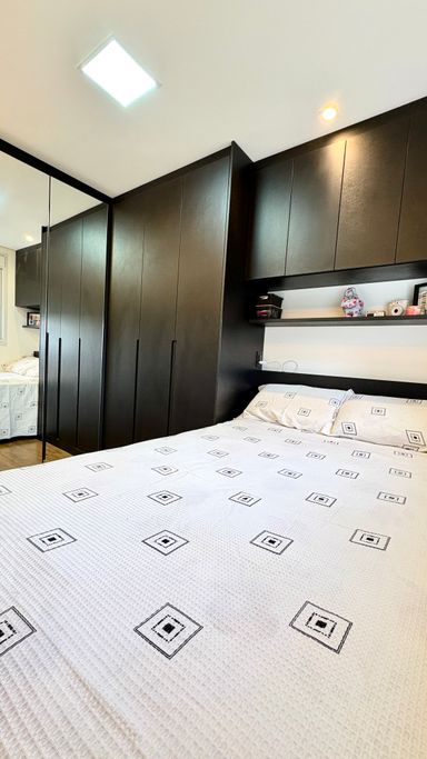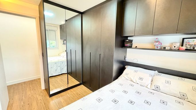 🛏️ 3 quartos, sendo 1 suíte com espaço para cama queen, ambos equipados com armários planejados e modulares de ótima qualidade.