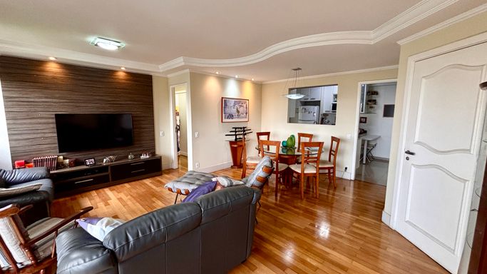 São três dormitórios com armários planejados, uma suíte, escritório, lavabo, uma sala espaçosa para dois ambientes e uma varanda incrível.