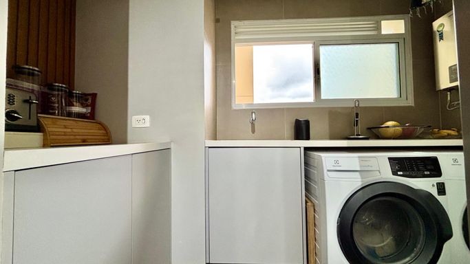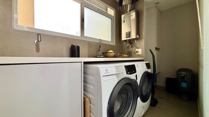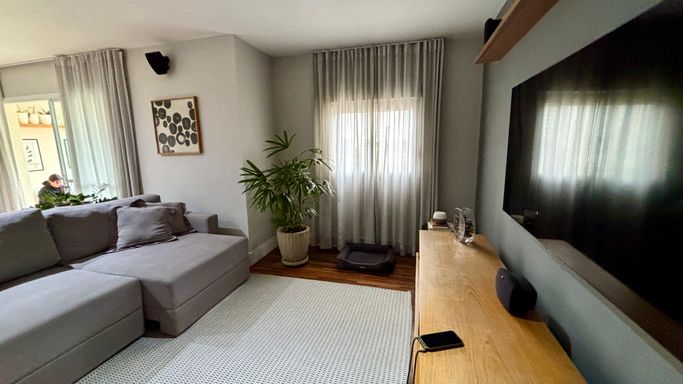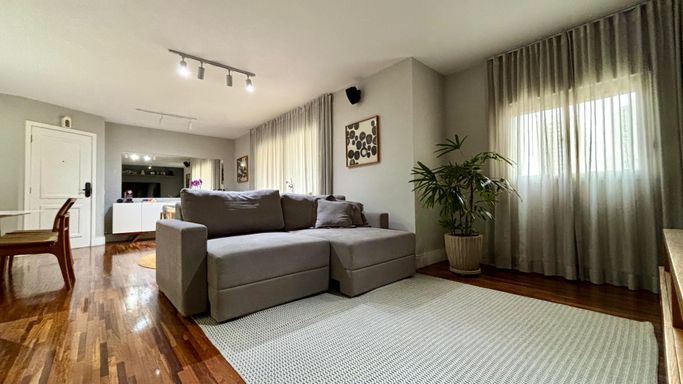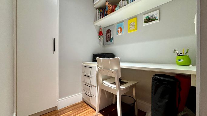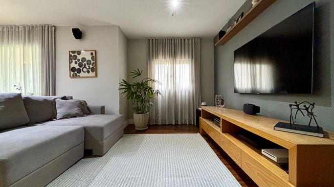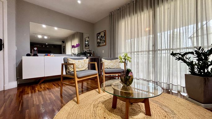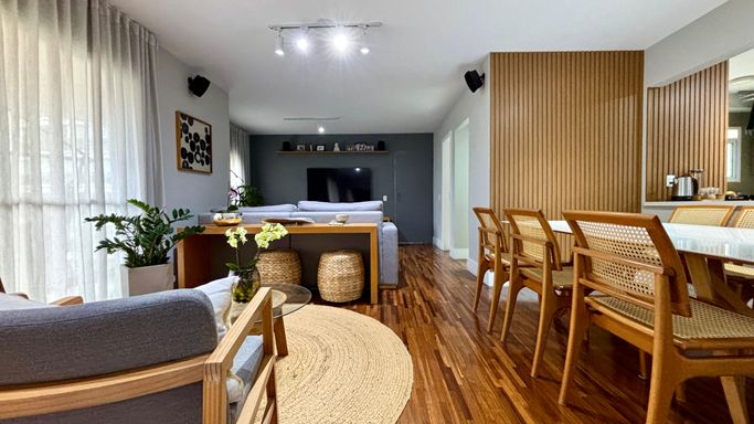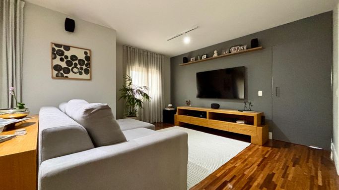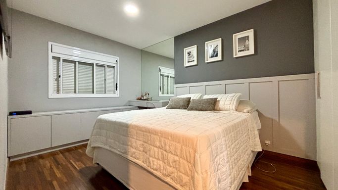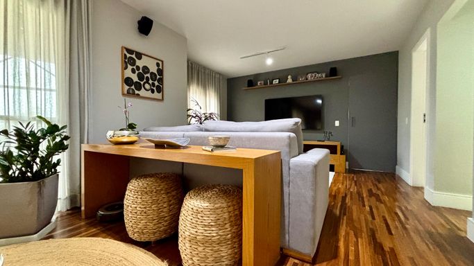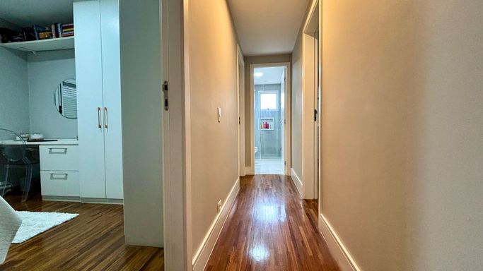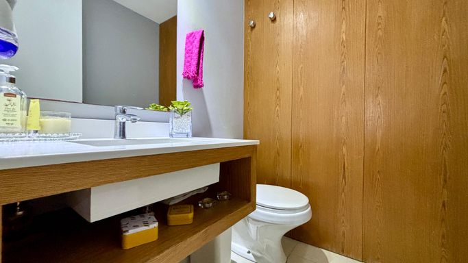O imóvel conta com sala ampla para dois ambientes, com piso de madeira, painel de TV planejado, teto rebaixado em gesso e iluminação embutida, proporcionando um ambiente moderno e acolhedor. Possui lavabo, além de 3 dormitórios, sendo 1 suíte, todos com armários planejados. Os banheiros são completos, equipados com box Blindex, pia, espelho e gabinete.