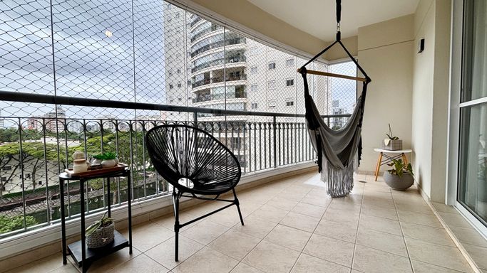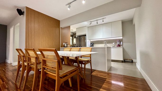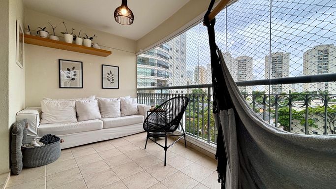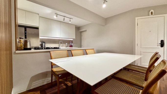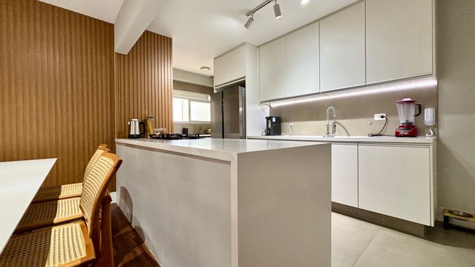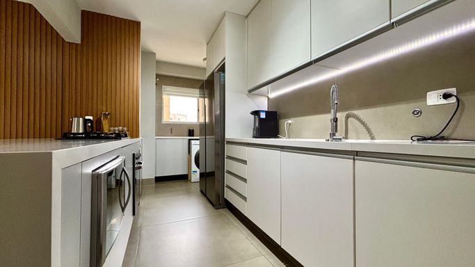 A cozinha é funcional e bem distribuída, com armários planejados, integrada à praticidade do dia a dia. A varanda é fechada com vidro, ideal para momentos de lazer ou descanso. O apartamento dispõe ainda de 2 vagas de garagem.