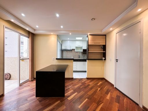 Apartamento com 75 m² distribuido em 3 quartos, 1 banheiro, sala ampla para dois ambientes, cozinha com armários planejados e lavanderia, 1 vaga de garagem, com sanca de gesso e iluminação planejada.