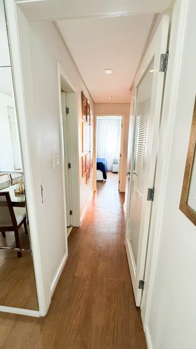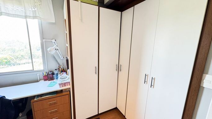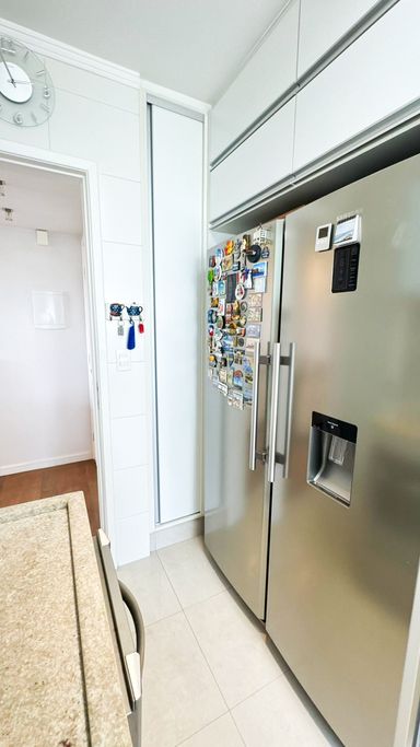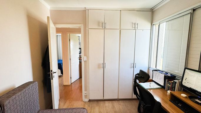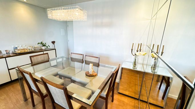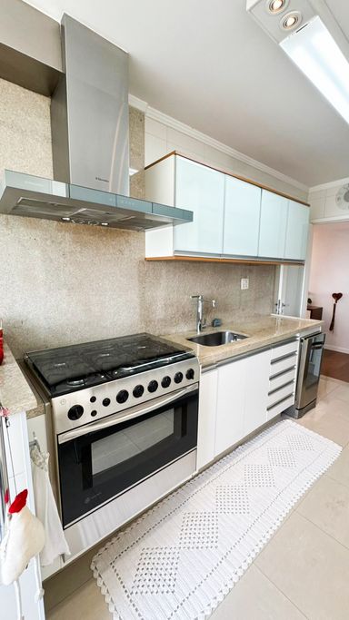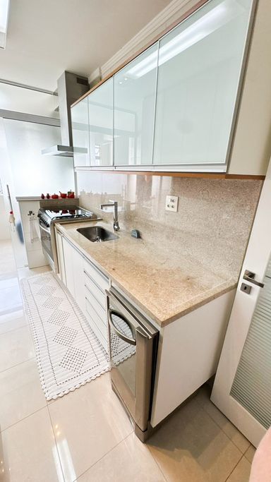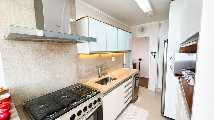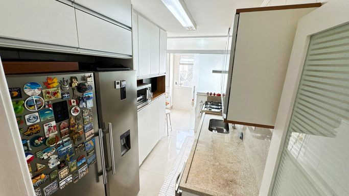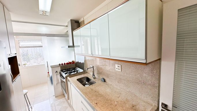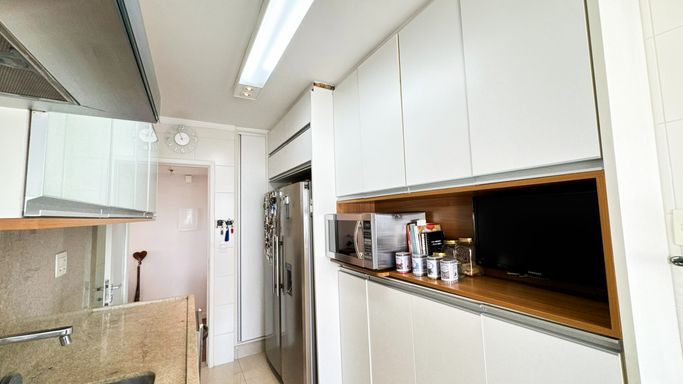 São 82m² bem distribuídos, com hall de entrada ampliado, sala para 2 ambientes com piso vinílico na área social, 3 dormitórios com armários planejados, sendo 1 suíte, além de 2 banheiros, cozinha repleta de armários e dependência de serviço com armários.