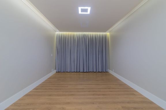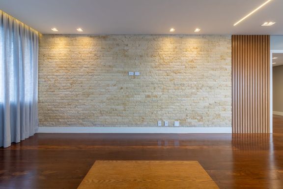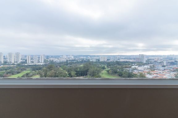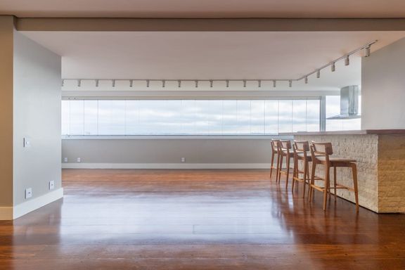 Sala bem ampla com varanda fechada com janela em vidro laminado de escamas com abertura em vão de 8 metros