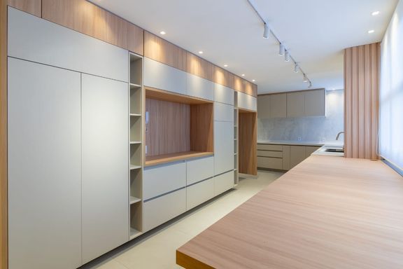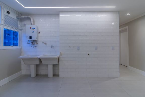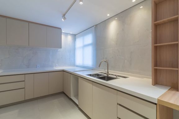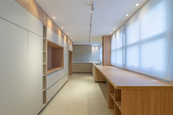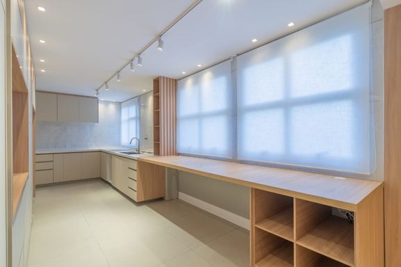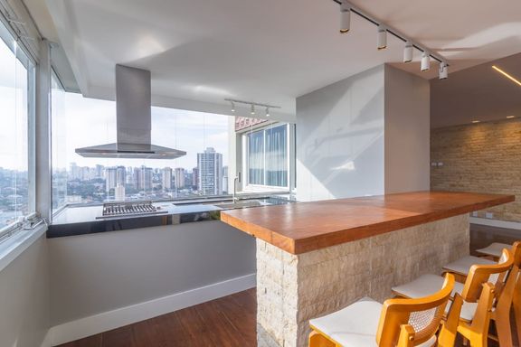 Área gourmet na sala com balcão e bancada de 3 metros com churrasqueira elétrica, coifa e pia