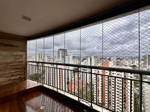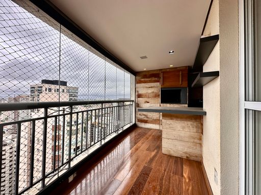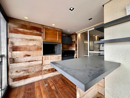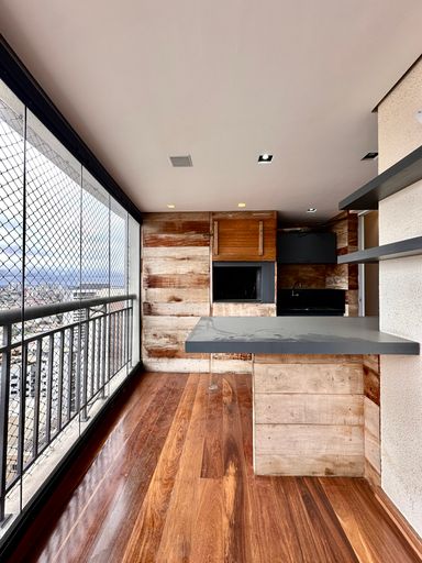 Andar alto e vista livre sacada com piso de madeira e churrasqueira, fechado com vidro .