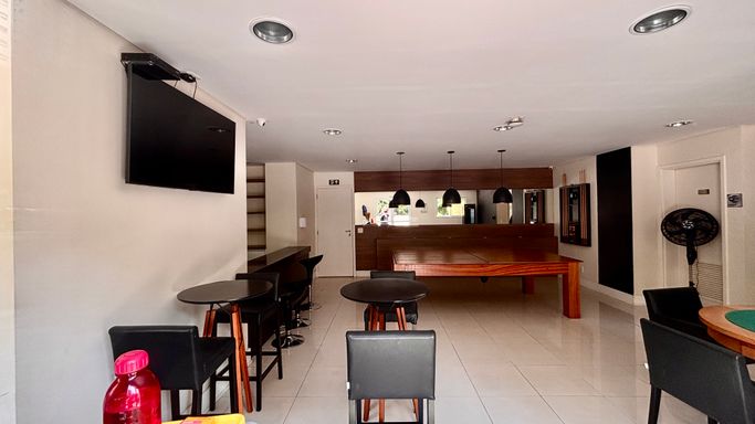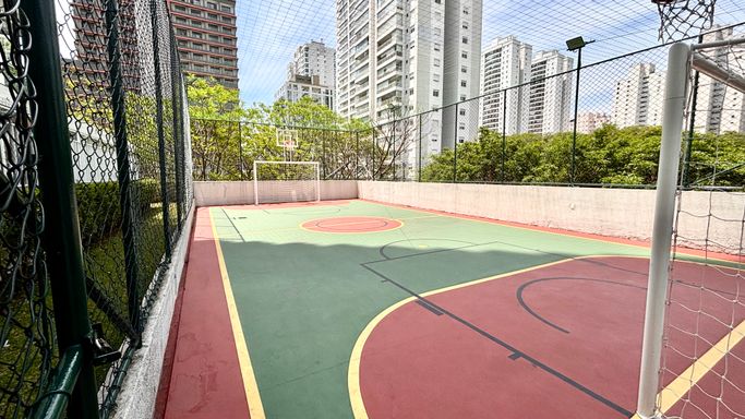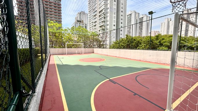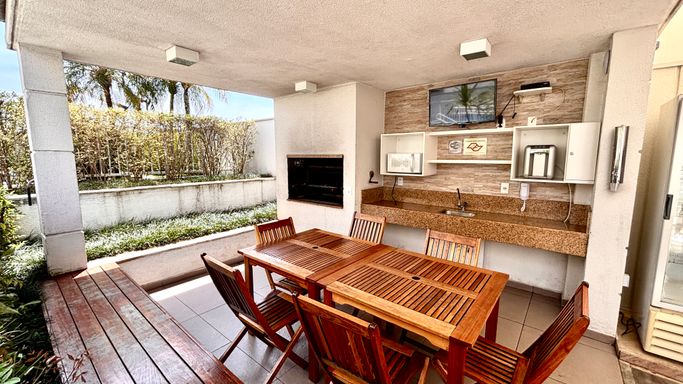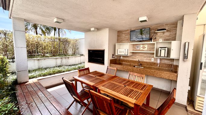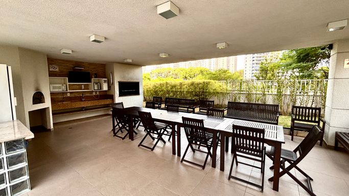 No lazer, academia reformada, churrasqueira ao lado da quadra e a segunda churrasqueira bem ao lado da piscina.