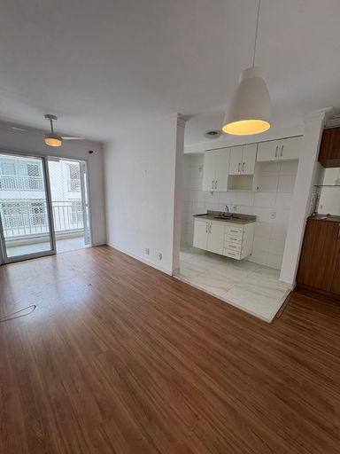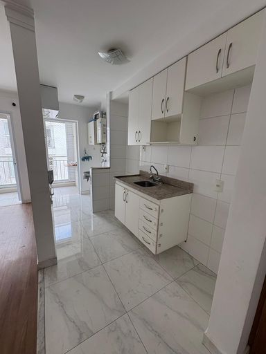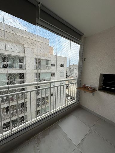 Apartamento para locação com 2 quartos, sendo uma suíte, cozinha e lavanderia com sacada fechada com vidro e churrasqueira na varanda.