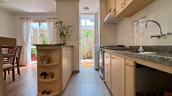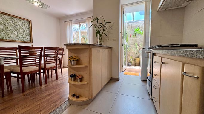 Cozinha americana com armários planejados, integrada à área de serviço