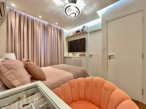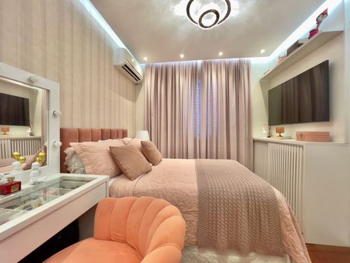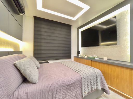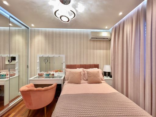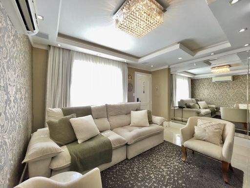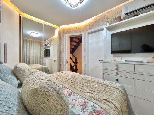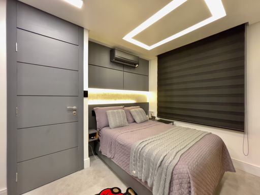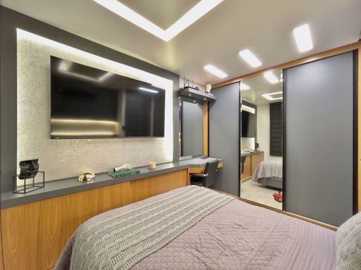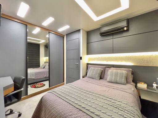 A casa com acabamento de primeira conta com um design moderno e funcional, com móveis planejados, piso em madeira e porcelanato, e ar-condicionado em todos ambientes.
