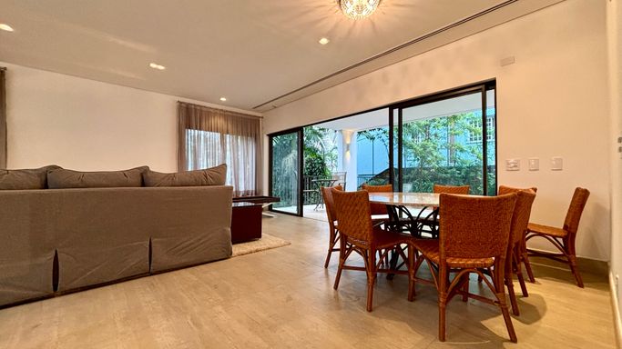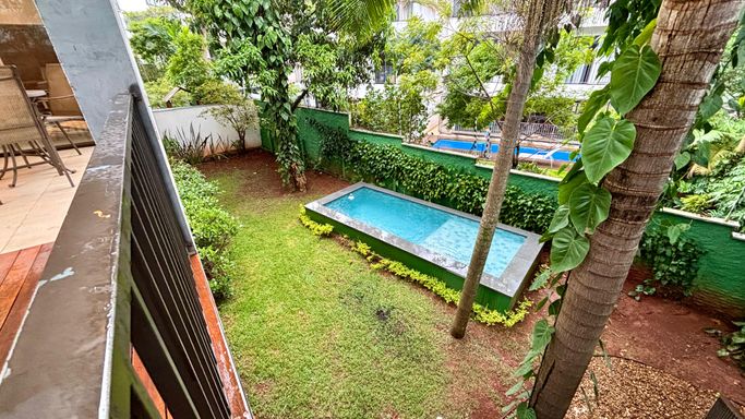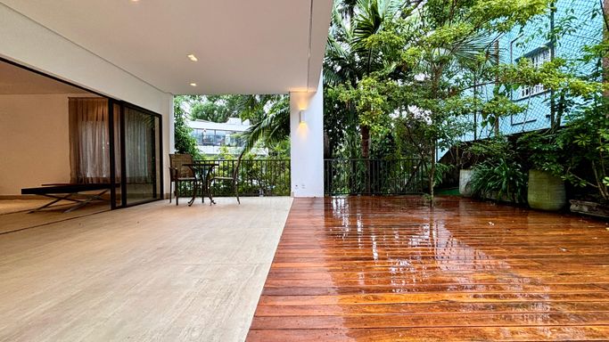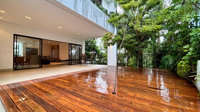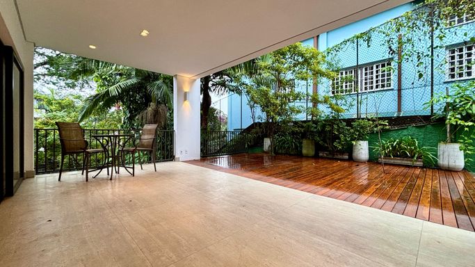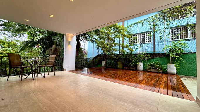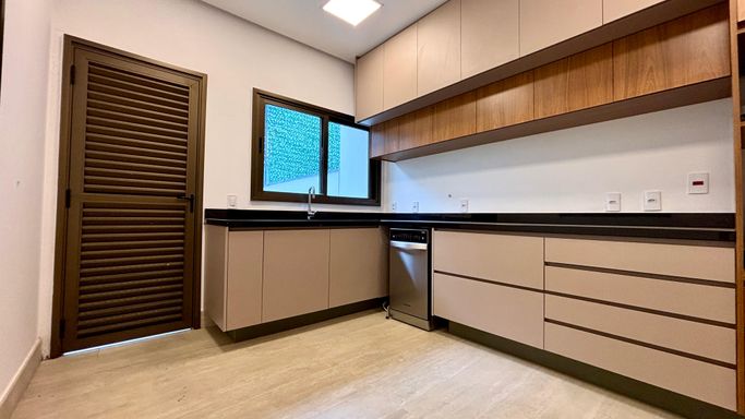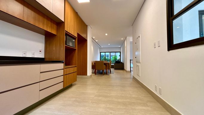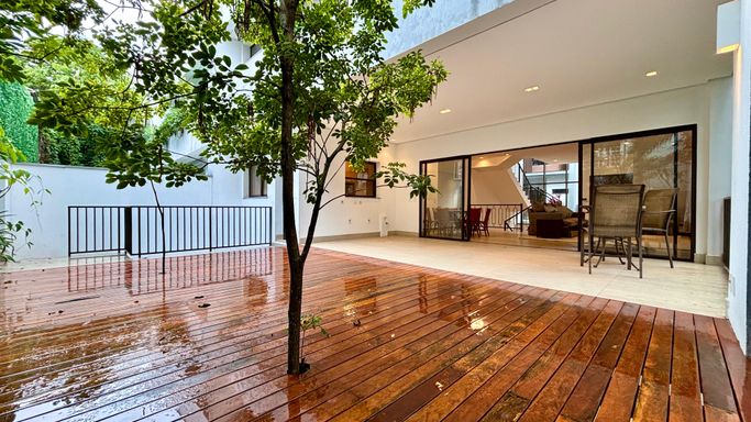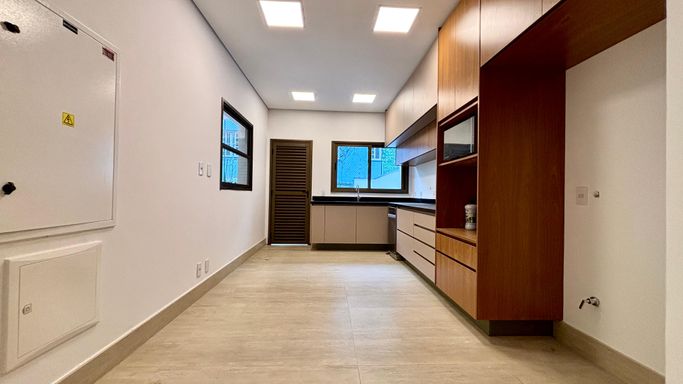 A cozinha ampla e integrada à sala de jantar também se destaca pela excelente iluminação externa, ideal para o convívio diário e recepções. O imóvel dispõe de quatro vagas de garagem cobertas e áreas externas cuidadosamente pensadas, com espaço verde arborizado que favorece a interação com a natureza e momentos em família, além de um deck com vista para as árvores — o cenário perfeito para relaxamento. No piso superior, também há uma área destinada a atividades ao ar livre, com potencial para a instalação de um espaço spa e churrasqueira a carvão, caso seja o desejo da família.